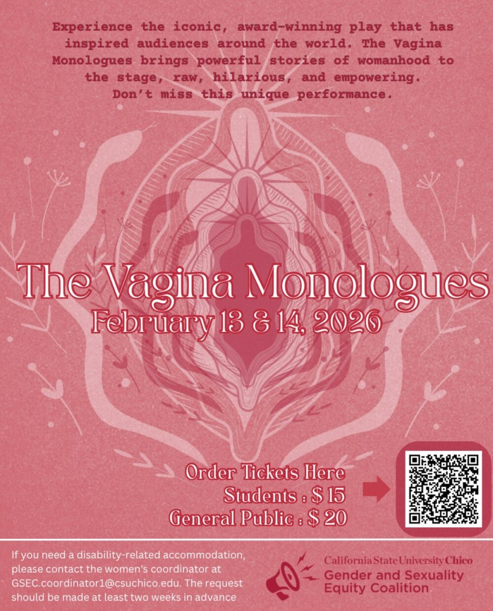 This event is committed to accessibility. If you require disability-related accommodations, please contact the Women’s Coordinator at gsec.coordinator1@csuchico.edu at least two weeks in advance.